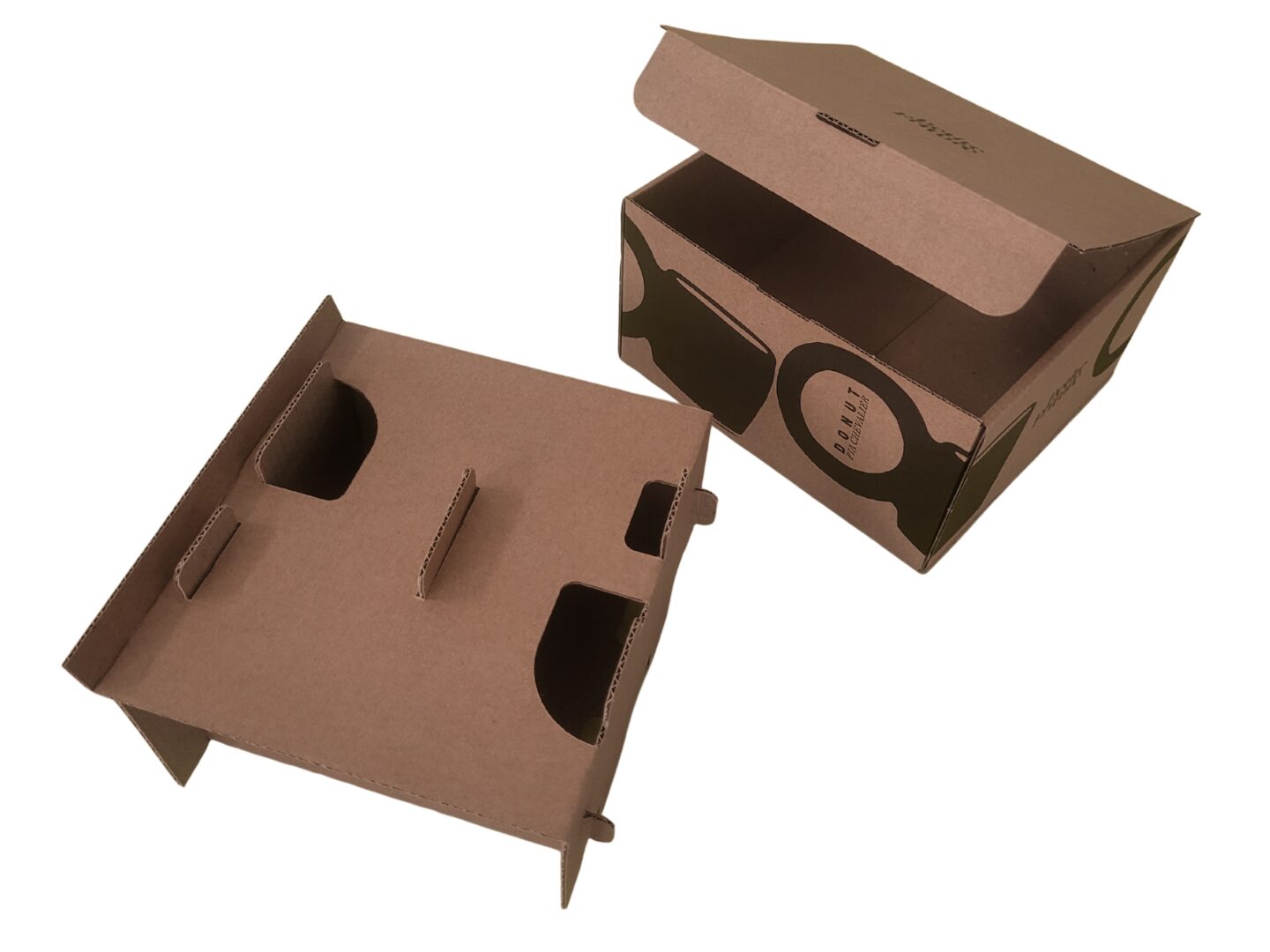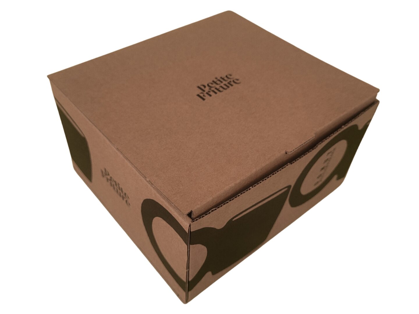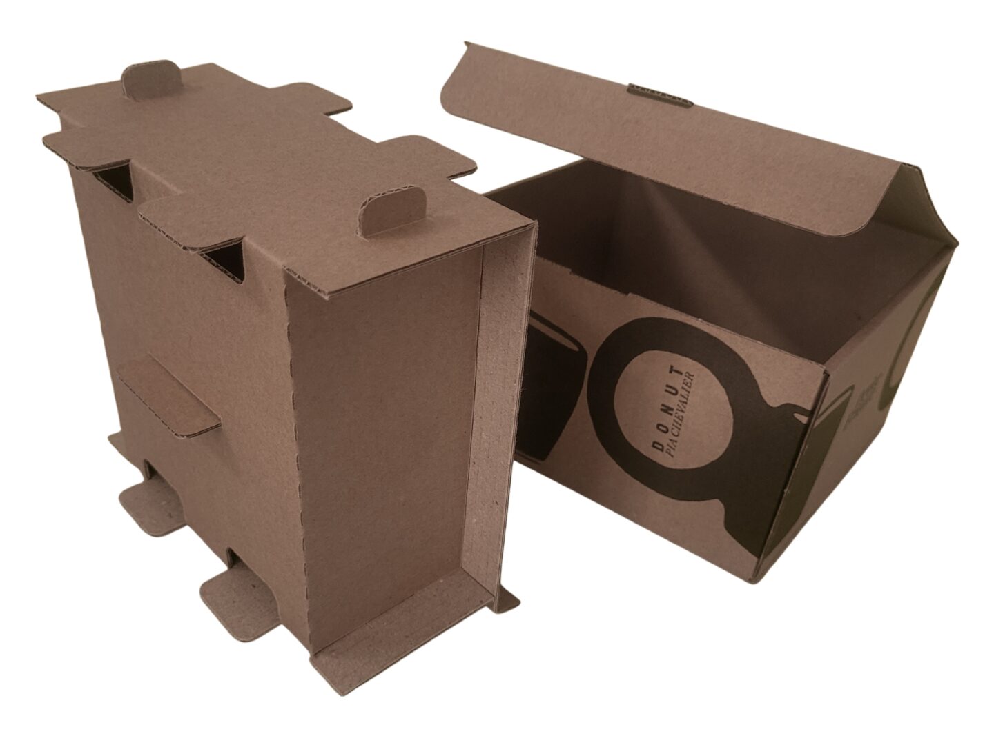 L’emballage ne se contente pas d’être fonctionnel : il devient également un vecteur d’identité visuelle. Sur la surface extérieure du carton, le logo du client est imprimé en noir avec une précision qui met en valeur la typographie de la marque. Des illustrations graphiques évoquant la silhouette de la tasse entourent la boîte et lui donnent un style à la fois épuré et contemporain.