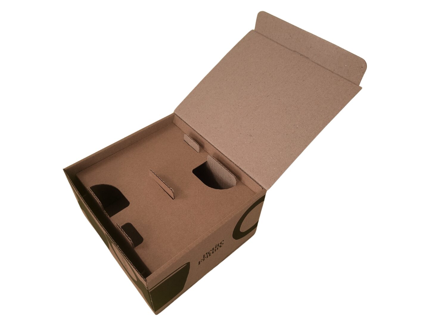 À l’intérieur, un calage en carton indépendant complète la protection. Sa géométrie a été pensée pour bloquer la tasse à plusieurs points stratégiques. Les encoches et languettes verrouillent l’objet, empêchant tout mouvement pendant le transport et absorbant les chocs. L’ensemble s’emboîte parfaitement pour un montage rapide.